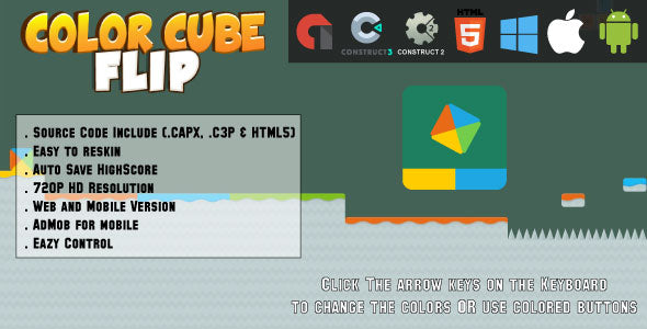 Color Cube Flip is a HTML5 game made with construct 2 and construct 3 Game Engines (Capx and C3p files included), click the arrow keys on keyboard to change the colors or use colored buttons on mobile.